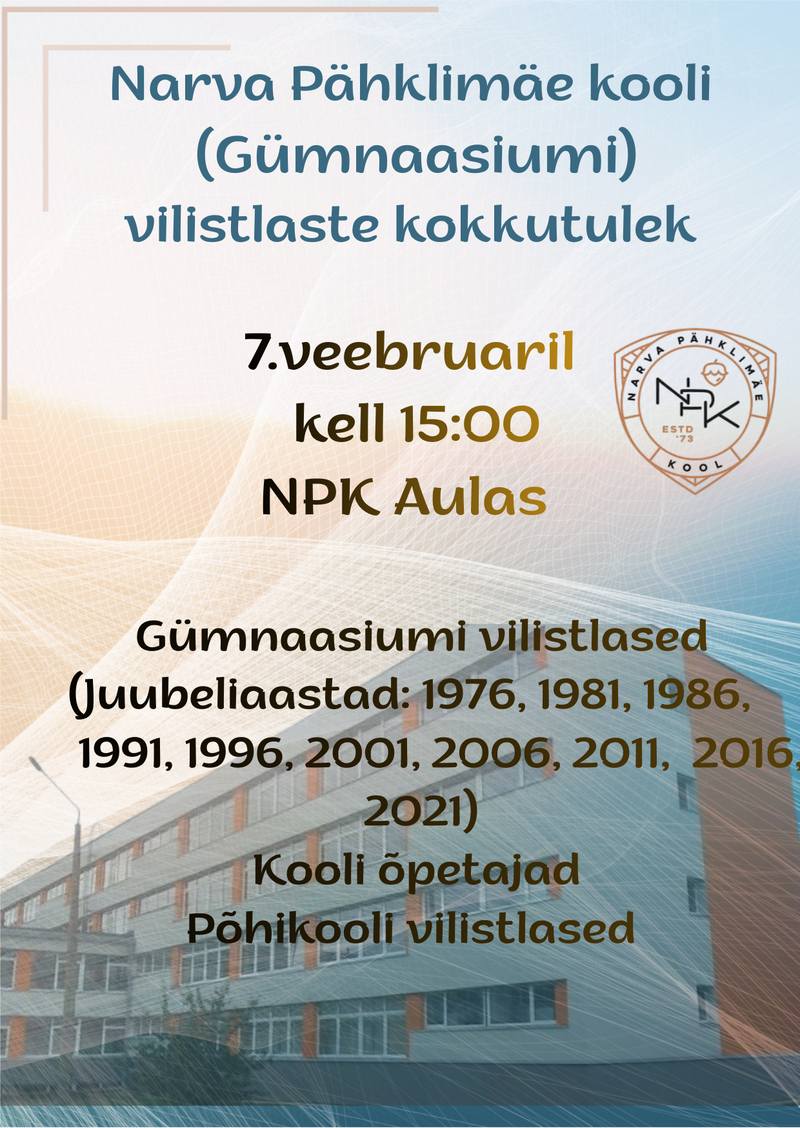 Приглашаем выпускников Пяхклимяэской гимназии (11 школы), учителей школы и выпускников 9 классов на традиционный вечер встречи, который состоится в первую субботу февраля (07.02.2026) в 15.00 в актовом зале школы.